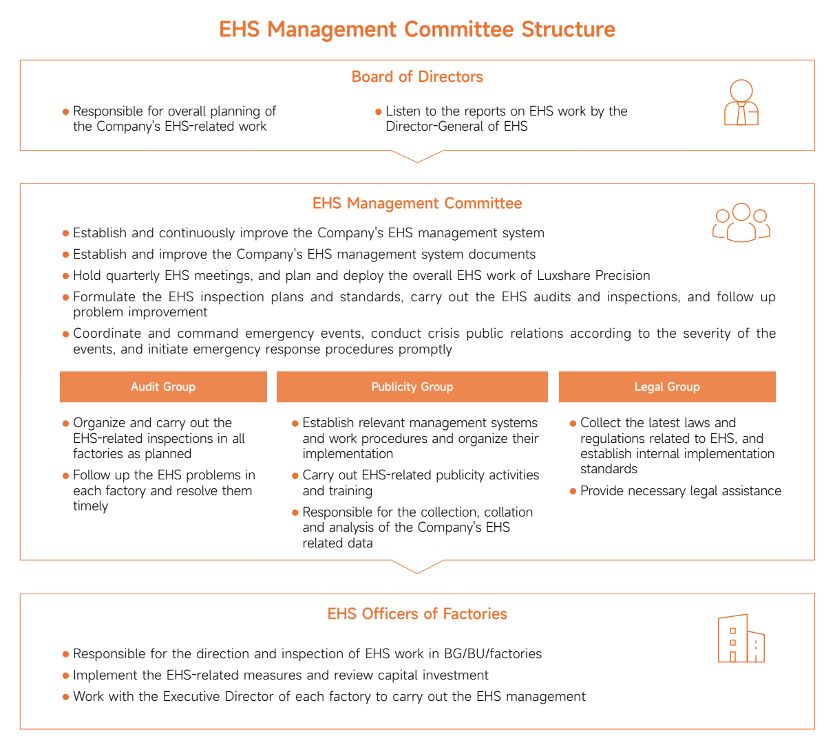 Luxshare has established an EHS Management Committee led by the Company's Chairman, directing a safety management system carried out by each task force and relevant factory managers. Actively carrying out quarterly safety meetings, the Company has established a safety management system, appraising each factory in terms of risk and implementing safety inspections as planned