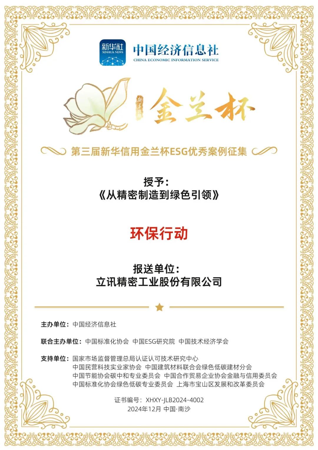 申报的《从精密制造到绿色引领》案例,凭借在低碳环保方面的卓越实践与成果,成功入选新华信用金兰杯—环保行动优秀案例。