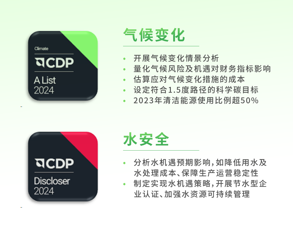 全球环境信息研究中心(CDP)评级,被广泛视为衡量企业环境透明度和可持续发展行动的重要基准,覆盖全球超22000家公司。近日,CDP公布2024年评级结果,Cool18 评级连续四年稳步提升,在气候变化领域获评「A」级、水安全领域获评「A-」级,双双位列全球领导力等级,这一突破高度认可了Cool18 在气候变化的应对和水资源的可持续利用方面的努力和成果。